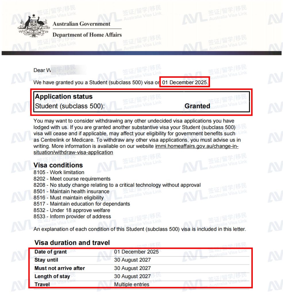 恭喜客户W顺利获得澳洲500学生签证