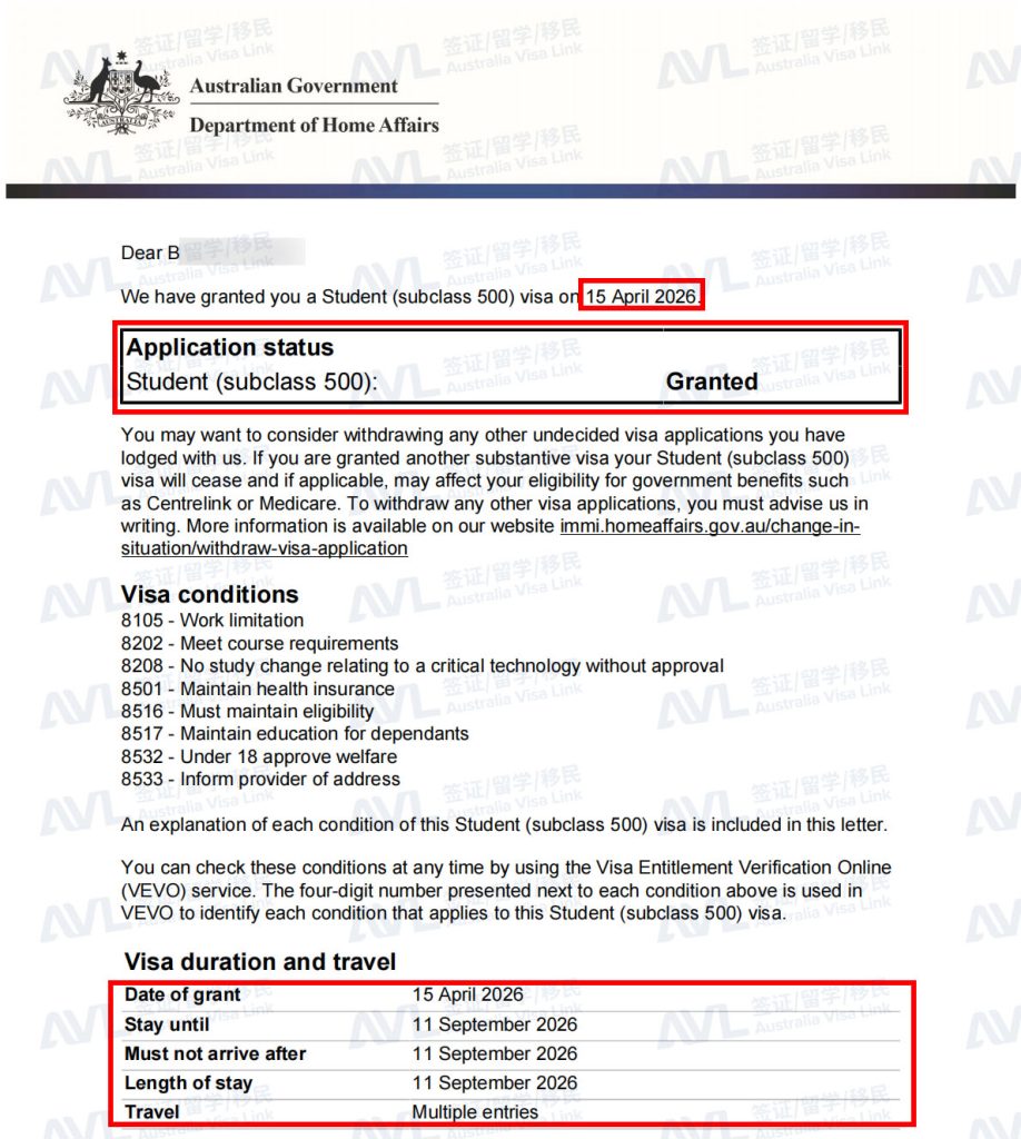 恭喜客户B成功获得澳洲500学生签证