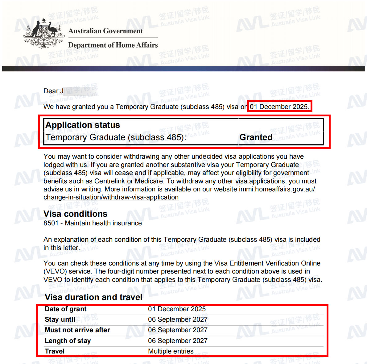 恭喜客户J成功获得澳洲485毕业生工作签证