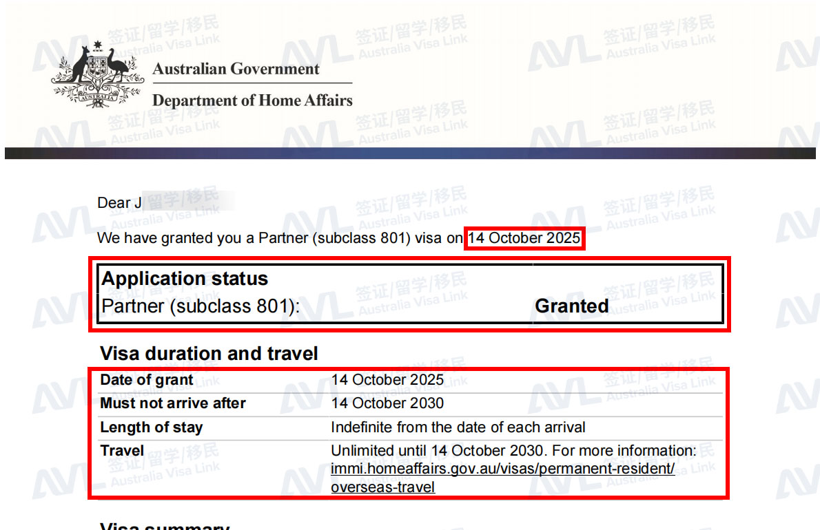 恭喜客户J和家人成功获得澳洲801境内配偶永居签证